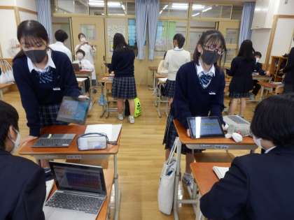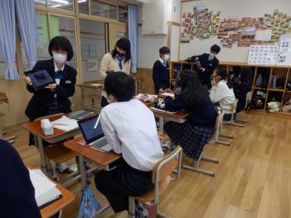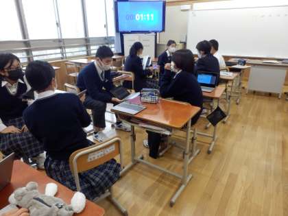 本日4限の蓮花タイムでは,個人で考えた防災に関するプレゼンテーションの中間発表を行いました。6枚のスライドにまとめた自分のプレゼンテーションを,何回か繰り返し違う人に紹介し,その都度アドバイスをもらって改善していました。個々に関心のある分野が違い,聞いている人にとっても学びになったようです。