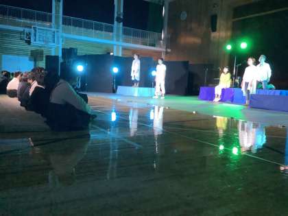 体育館が暗くなりいよいよ開演。劇団の人たちが登場し迫真の演技を見せると,食い入るように見つめていました。ダンスや歌の場面では目を輝かせて,思わず手拍子を送っていました。