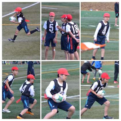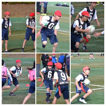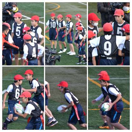 第1回全国小学生タグラグビー選手権京都府予選セレマChampionshipが本日宝が池球技場で行われました。本校のタグラグビー部5、6年生が3チームに分かれて出場しました。そのリーグ戦の様子をお届けします。秀蓮の初戦はAチームが下鳥羽小との対戦でした。
