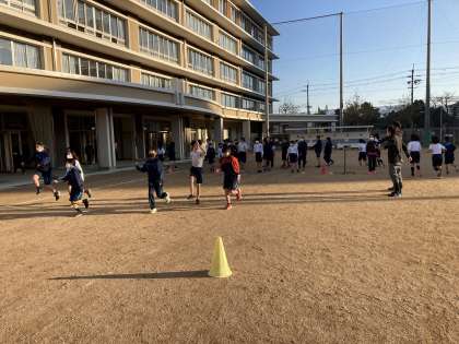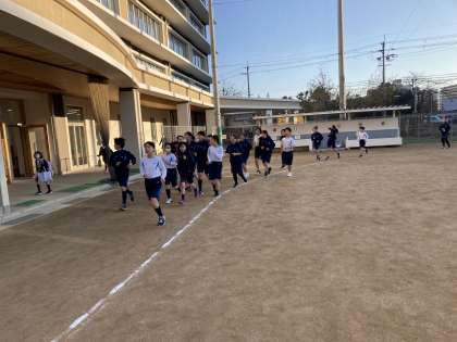 寒い中,子どもたちは一生懸命走っています。「5分で○周」,「5周を○分○秒」,「○○さんについていく。」など,それぞれが目標をもち,取り組んでいます。