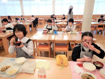 家庭科『食べて元気!ご飯とみそ汁』の学習のハイライトである,ご飯とみそ汁の調理実習を行いました。このクラスも,前回の出汁をとる実習に比べて,各班ともにスムーズに作業を進められました。