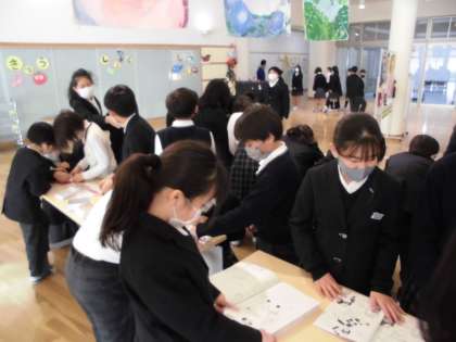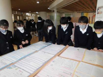 今日は,学級ごとに校内に展示されている本校生徒の作品を