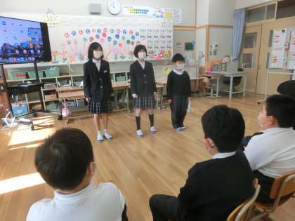 そして今日,それぞれのグループの練習の成果を披露しあいました。「くじらぐも」チームは場面ごとにグループを結成し発表しました。自分の担当のところを楽しそうに音読していました。「ガラスめだま」チームはおばあさんや動物などの役に分かれ,事前に録音したものを披露しました。