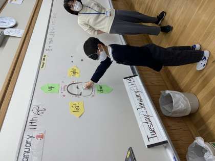 新しい単元に入りました。今回は,4年生でも少し学習しましたが,右や左,上がったり下がったりする表現を使いながら,道案内をする単元です。1時間の今日は,新年ということもあり,福笑いをしながら,4つの表現に慣れ親しみました。表現を英語に変えるだけで,面白さが倍増しましたね。