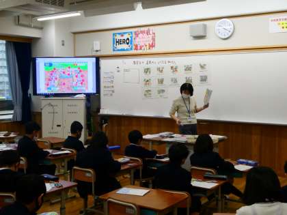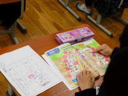 先生の発音を聞いて教室を指で押さえたり,道をたどったりする活動を通して,教室や道案内のしかたを知りました。