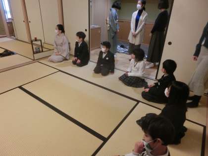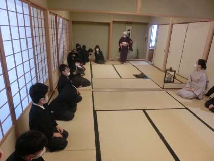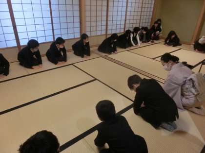 「こころ科」の授業でゲストティーチャーを招いて「茶道体験」をしました。「茶道」を知っている生徒も知らなかった生徒も楽しみながらお作法やおもてなしの心について学ぶことができました。お茶をたてるときは,いつになく真剣な表情でした。和菓子もおいしかったようで,少しずつ味わいながらいただきました。とてもよい経験になりました。