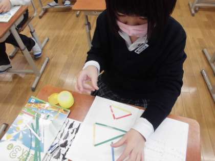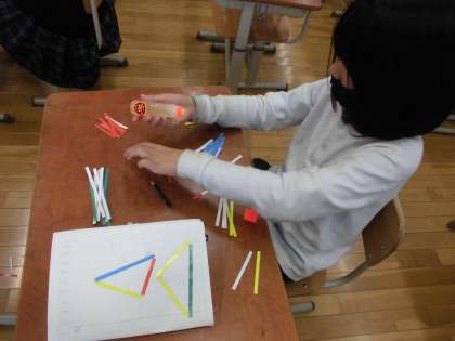 算数「三角形」では,色のついた棒を使って,いろいろな三角形をつくりました。