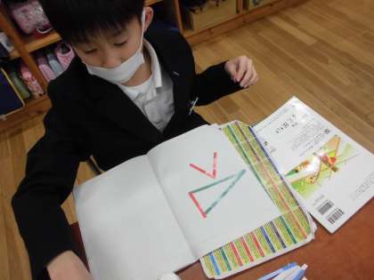 友達と三角形を見せ合いながら楽しそうに学習していました。