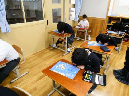 図画工作科では,版画の学習の仕上げに向けて学習を進めています。子どもたちは,彫り進める彫刻刀を考えて選び,慎重に彫っていました。