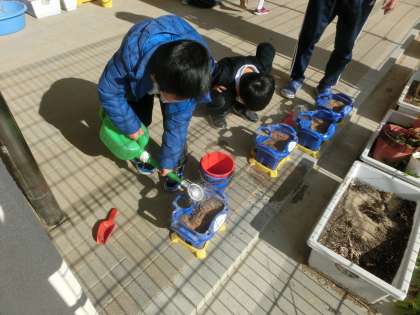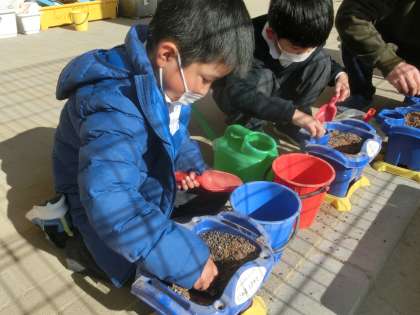 チューリップの球根を植えました。「春になったら花がさくね」「入学してくる1年生にみてもらえるね」と,ていねいに気もちをこめて植えました。春がとても楽しみになった1年生でした。