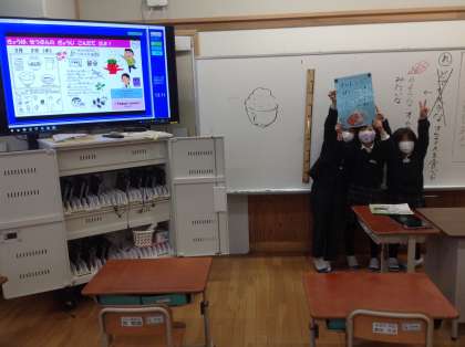 たんにんの先生が 前のホワイトボードに チャレンジカードをはって はげまします!