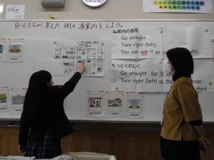 今日の英語科『Where is the gym?』では,英語で道案内ができるようになることを目標に学習を進めてきました。この日は,子どもたちが考えたオリジナルの町紹介を英語で行いました。町の名前や,おすすめの施設も自分たちで考えています。楽しそうに英語でやり取りする姿が印象的でした。