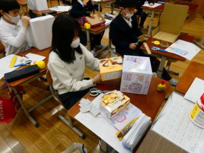 もってきた空き箱を,自分のオリジナルボックスにするために箱を組み合わせたり,材料を貼り付けたりして作り始めています。