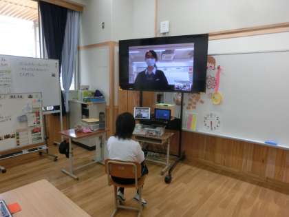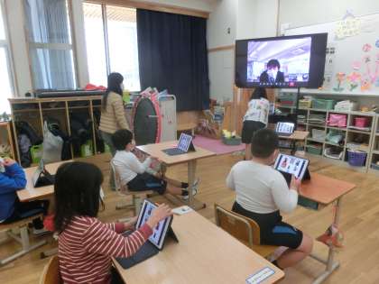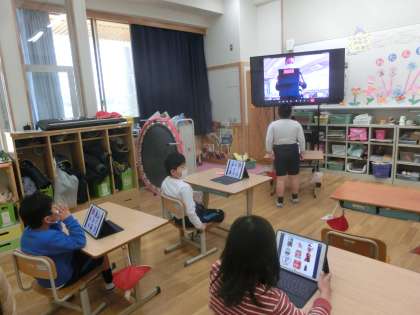 今日は今年度最後の英語の学習でした。「あ・い」と「う・え」の教室をビデオ会議でつないで学習しまた。「What〜 do you like」「I like〜」 友だちの好きなキャラクターや動物をたずねて,ビンゴゲームをしました。リモートだと言葉だけでは伝わりにくいのでジェスチャーをつけて表現していました。これからも楽しく英語を学習していってほしいと思います。