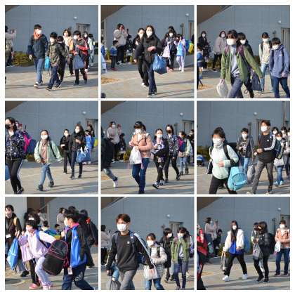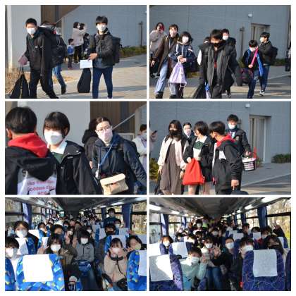 バスに向かっています。みんな良い表情です。まずは、世界遺産を巡るということで、清水寺に向かいます。