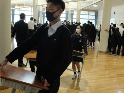 着任式・始業式前の教室移動では,9年生は2年生のお手伝いをしてくれました。1年生から2年生になる生徒にやさしく声をかけて机を運んであげる姿。とてもほほえましいです。1年生から9年生までがいる本校ならではの良い姿でした。