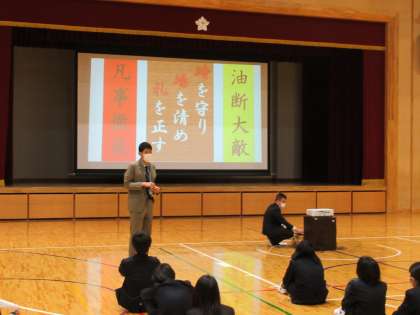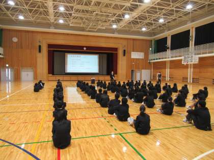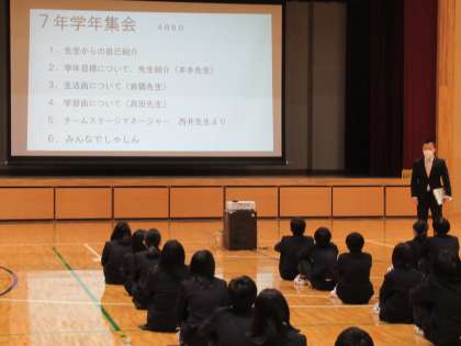 7年生の学年集会を行いました。7年生の学年目標は「やればできる!」後期課程になって,勉強が難しくなり,部活動もハードになります。さまざまなことに果敢に挑戦し,力を伸ばしていってほしいと思います。
