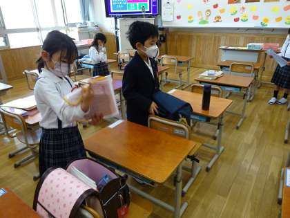まだまだ緊張した様子で教室に入ってくる子どもたち。