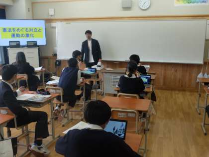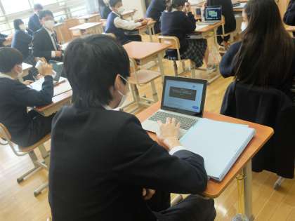 9年生の社会では,授業のはじめにGIGA端末等を活用して「最近,気になったニュース」を交流していました。最近のニュースと授業内容を結びつけることで,生徒はより学習内容に関心をもつことができているようでした。