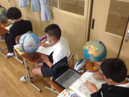 世界地図や地球儀を楽しそうに眺め,活用しています!!