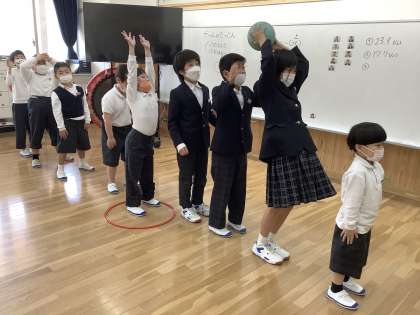 1組目標の「つたえあう」「たすけあう」をめあてに,「ボールはこびゲーム」をしました。「ゲームのたつじん」の単元では,様々なゲームを通して言葉で思いを伝えあい,仲間と協力しあうことを学んでいきます。1〜6年生のたてわりグループ「ひだまりチーム」と「そよかぜチーム」にわかれて活動していきます。