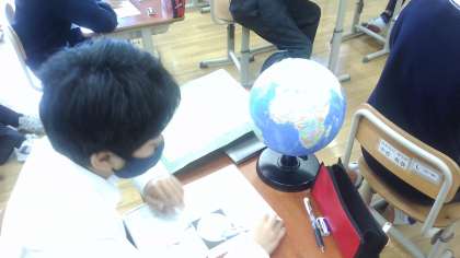 7年生社会科では,『世界の姿』という単元のもと,これまで自分たちが住む地球をGIGA端末から眺め,様々な国の名前と位置の学習を行ってきました。連日,どこのクラスの自学自習シートにも,進んで国名や,国旗を覚えようとする様子が見られます。また,中には「国旗にあるマークや色,デザインには意味があるのではないか?」という仮説を立て,調べてきた人もいました。また,自分たちが普段テレビで見るアニメを題材に,,地球の「緯度と経度」についての学習を行いました。