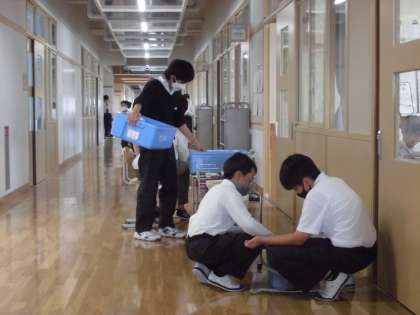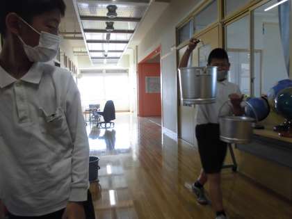給食が始まってすぐの頃,6・7年生のお兄さんお姉さんが,5年生の配膳が終わった食缶を回収場所まで運んでくれていました。