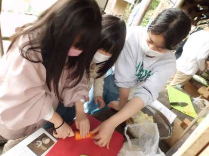 この日のビッグイベントは,なんといっても野外炊事!朝はパックドッグ,昼はカレーを作りました。4年生のみんなは,8年生のお兄さん・お姉さんの手際の良さに感動しながらも,かまどでは薪に火をつけたり,材料を切ったりと,積極的にテキパキと動いていました。みんなで作った料理は,本当に格別のおいしさだったのでしょう。カメラを向けると,とびきりの笑顔で「おいしい〜♪」という声があちらこちらから聞こえてきました。とても素敵な思い出ができましたね!