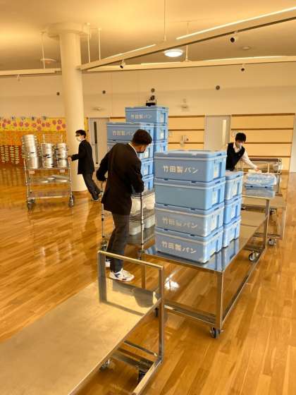 ステージ全体の食缶,トレー,しゃもじ,おたまなどの数を確認し,自分たちでエレベーターに乗せ,給食室の片付けをしてくれます。