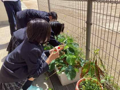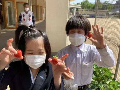 1組教室前のプランターで「いちご」を育てています。今年はたくさん収穫できています!「おいしい〇〇〇にしよう」と楽しみにしています。