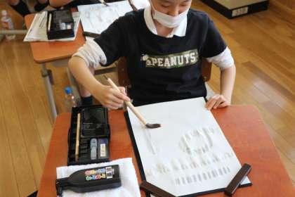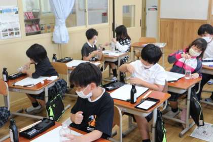 4組の書写の学習で,はじめて毛筆を使いました。道具の説明をしてから,ぼくじゅうではなく水を使って線を書きました。やわらかい筆の感触を確かめながら書き進めている姿が見られました。次はぼくじゅうを使います。楽しみですね。