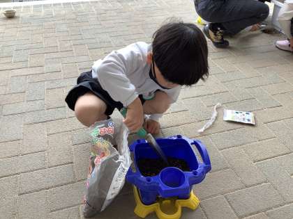植木鉢に朝顔の種を植えました。種を観察したり,土や肥料の量を考えたりしながら植えました。「早く大きくなって」と言いながら水をやっていました。