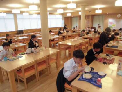 黙食のため,ゆったりとした音楽を聴きながら食べています。