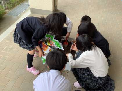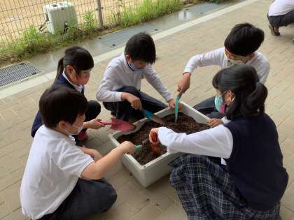 プランターや畑で夏野菜の栽培をしています。土づくりからすべて自分たちでやっています。おいしい野菜がたくさんとれるように,みんなで協力して世話をしようね,と話しています。
