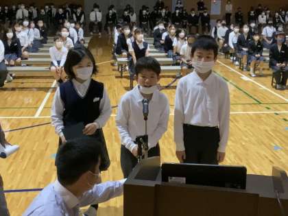 4年生の「山の家報告会」がありました。1〜3年生にはその様子がリモート配信されました。1組からも4年生の代表が発表しました。「ぜんぜん緊張しなかった!」と,とても堂々と発表していました。