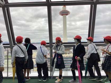 社会の学習で京都駅ビルの大階段や空中経路から京都市の街の様子を見てきました!京都駅構内の全体を見渡せたり,京都の街並みが望めたり,とてもいい学習ができました。学習の振り返りでは「京都タワーがとても大きくてびっくりしました。線路や道,山がたくさん見えました」と京都市の街の様子を話していました。