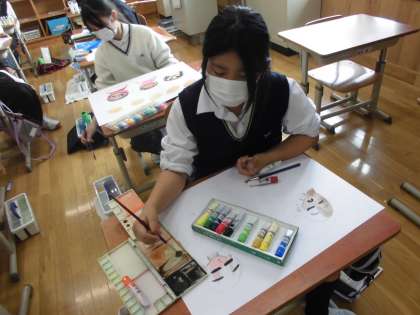 構図を考え,コンテや絵の具で色をつけていきました。