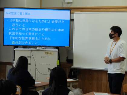 9年生は蓮花タイムで平和について考えています。今日は,今の世界の現状や日本がおかれている状況を知った上で,自分たちに何ができるかをじっくりと考えて「平和宣言」を書きました。