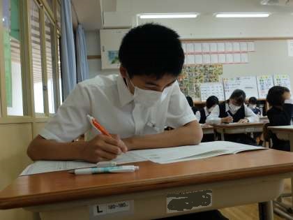 2日目の総括考査です。今日も自分の力を出し切ろうとがんばる8年生です。『がんばった自分を信じよう!』