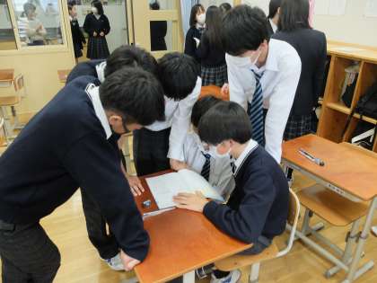 9年生担任の先生はテスト前になるといつも言っています。「テストは個人戦だけど,テスト勉強は団体戦!」これは一緒に勉強をするという意味だけではなく,「みんなががんばっているから私もがんばろう!」という意識も含みますが,みんなで問題を囲んでいる姿を見ていると,担任の先生が言っている姿が体現されているなとうれしくなりました。