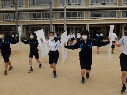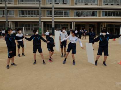 学年種目「パーテーションリレー」,5人で4枚のパーテーションを運びます。なかなか難しそうですが,楽しそうです。