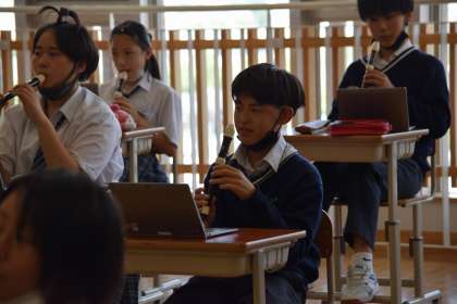 カメラを切り替え,自身の指の動きを確認しながら練習する生徒や,音源を再生しながら練習する生徒もいて,思わず「すごい練習方法ですね。」と声をかけると,「家でも同じような感じで練習しています。」と教えてくれました。