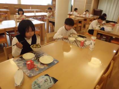 食育の授業が終わり,今日はランチルームで給食を食べました。
