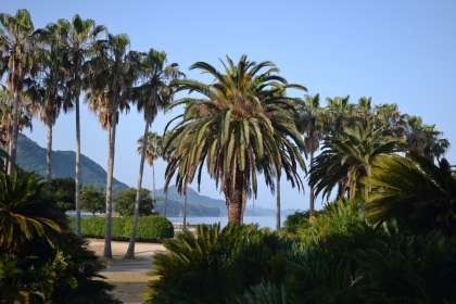 おはようございます。広島県竹原市大久野島の朝は快晴です。今日も暑くなりそうです。宿舎の外の椰子の木が南国にいるかのような気にさせてくれます。