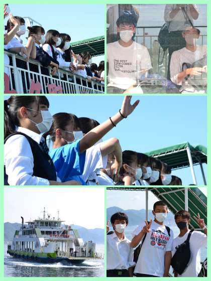 現在、バスに乗り換え、各体験会場に移動しています。写真はフェリー内の様子です。見送ってくださる宿舎の方に手を振っています。私は幼少を小さな島で過ごしたので郷愁がつのります。