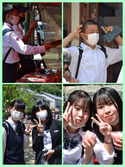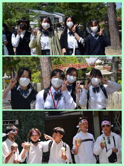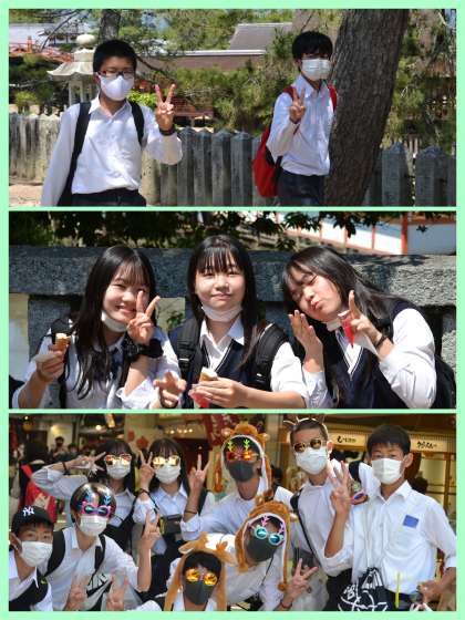 厳島神社見学の後は、自由行動です。家族へのお土産の買い物と食べ歩きを楽しんでいます。ここで各自昼食を取って集合です。