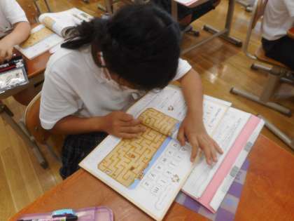 上の写真は小文字のアルファベット順にたどって迷路をクリアする活動です。
