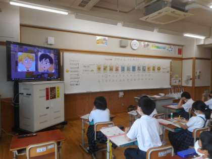 下の写真は,英語のストーリーを見ながら,新しい表現と出会う活動です。