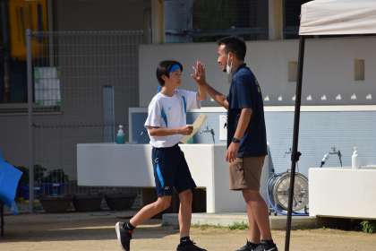 小学校時より一緒に頑張ってきた先生が9年生リーダーに労いの言葉をかけ,ハイタッチでみんなの健闘を讃えていました。