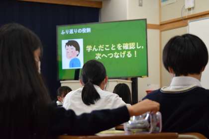 「ふりかえり」に必要な視点は?というテーマで,5・6年生の自学自習がより良いものとなるよう,自分たちも改めて「ふりかえり」の重要性を学習しました。